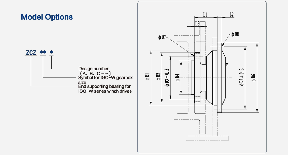 | แบบอย่าง | D1 | D2 | D3 | D4 | D5 | D6 | D7 | D8 | L1 | L2 | L3 | ขนาดกระปุกเกียร์ |