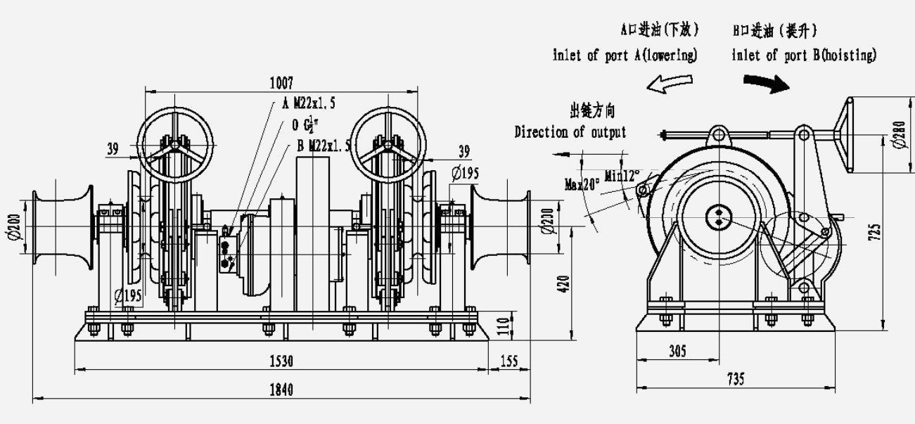 | แบบอย่าง | การทำงาน โหลด (เคเอ็น) | โอเวอร์โหลด ดึง (รน) | โฮลดิ้ง โหลด (เคเอ็น) | ความเร็วที่กำหนด ของกระจกหน้ารถ (เมตร/นาที) | แองเคอเรจ | ทั้งหมด การกระจัด (มล./รอบ) | เรตติ้ง ความดัน (มล./รอบ) | จัดหา oi1 โฟลว์ (ลิตร/นาที) | โซ่ เส้นผ่านศูนย์กลาง (มม.) |